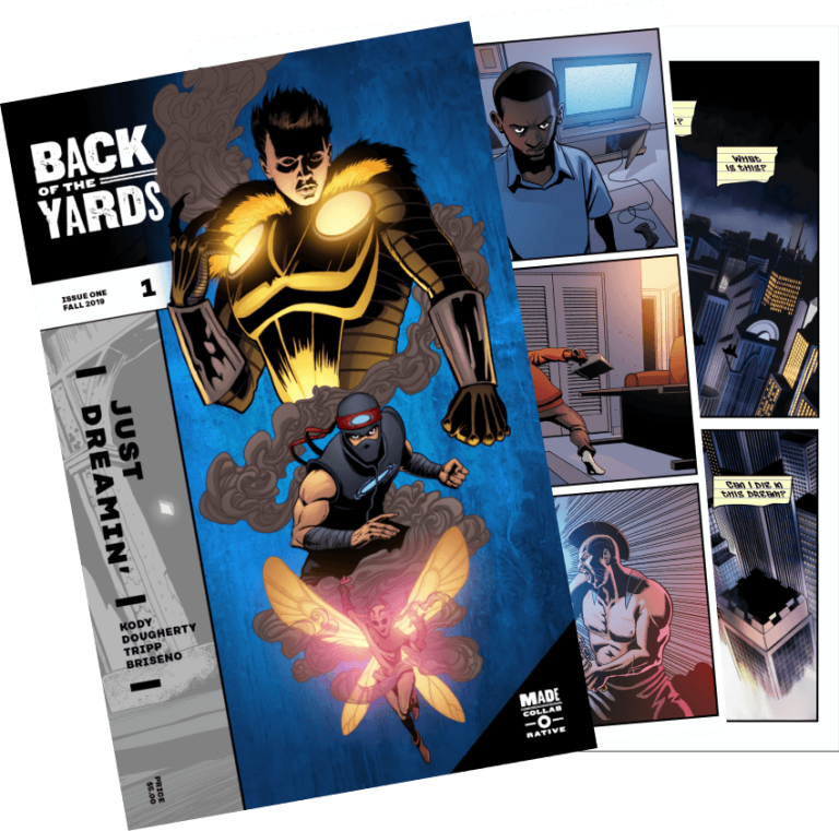 The collaborative backdrop of our Featured Collaborations is our inaugural comic series, The Back of the Yards, which was created as a result of our initial in-person collaborations with participating youth in the West Side of Chicago. Now, as you may or may not know by now, this project didn’t even start out as a comic project, much less a “virtual studio.”  No, in fact, this project started as a modest community project intended to connect artists with youth to generally collaborate with one another on independent creative projects.  That simple premise then evolved into a broader comic-based project based on those initial collaborations with participating youth in the West Side of Chicago, ultimately spawning the development of Issue 1 of our new comic series!